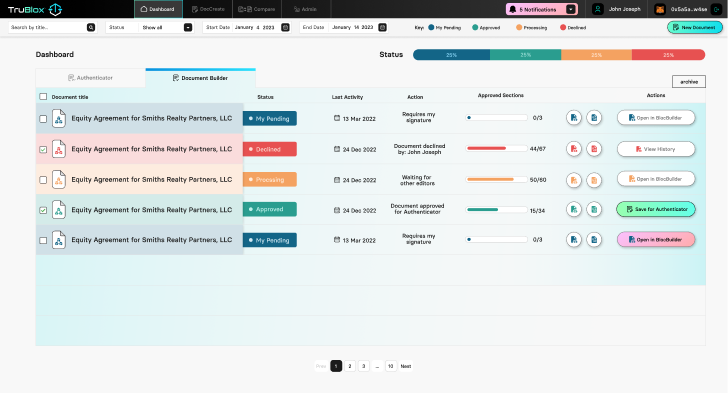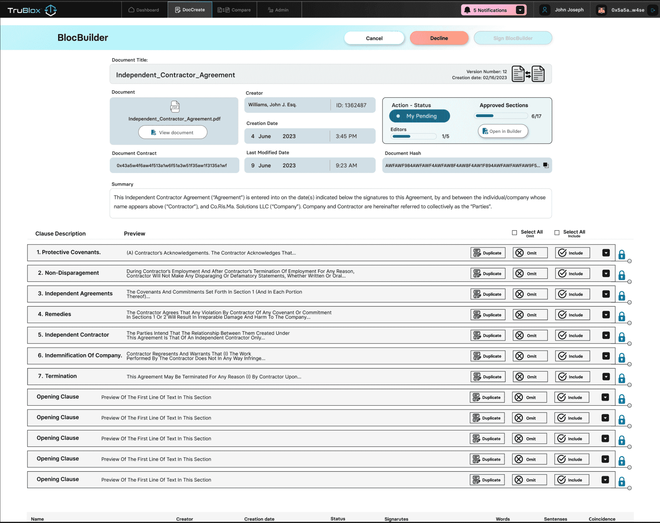 Our innovative BloxBuilder tool streamlines the creation of TruBlox documents, transforming traditional documents into trust-secured, blockchain-backed data with ease. Furthermore, our straightforward version comparison feature simplifies the review process, clearly highlighting differences between document versions.